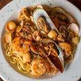 Sautéed shrimp, fresh salmon, sea scallops, mussels, clams, and garlic in white wine and light marinara sauce over linguini or angel hair pasta.